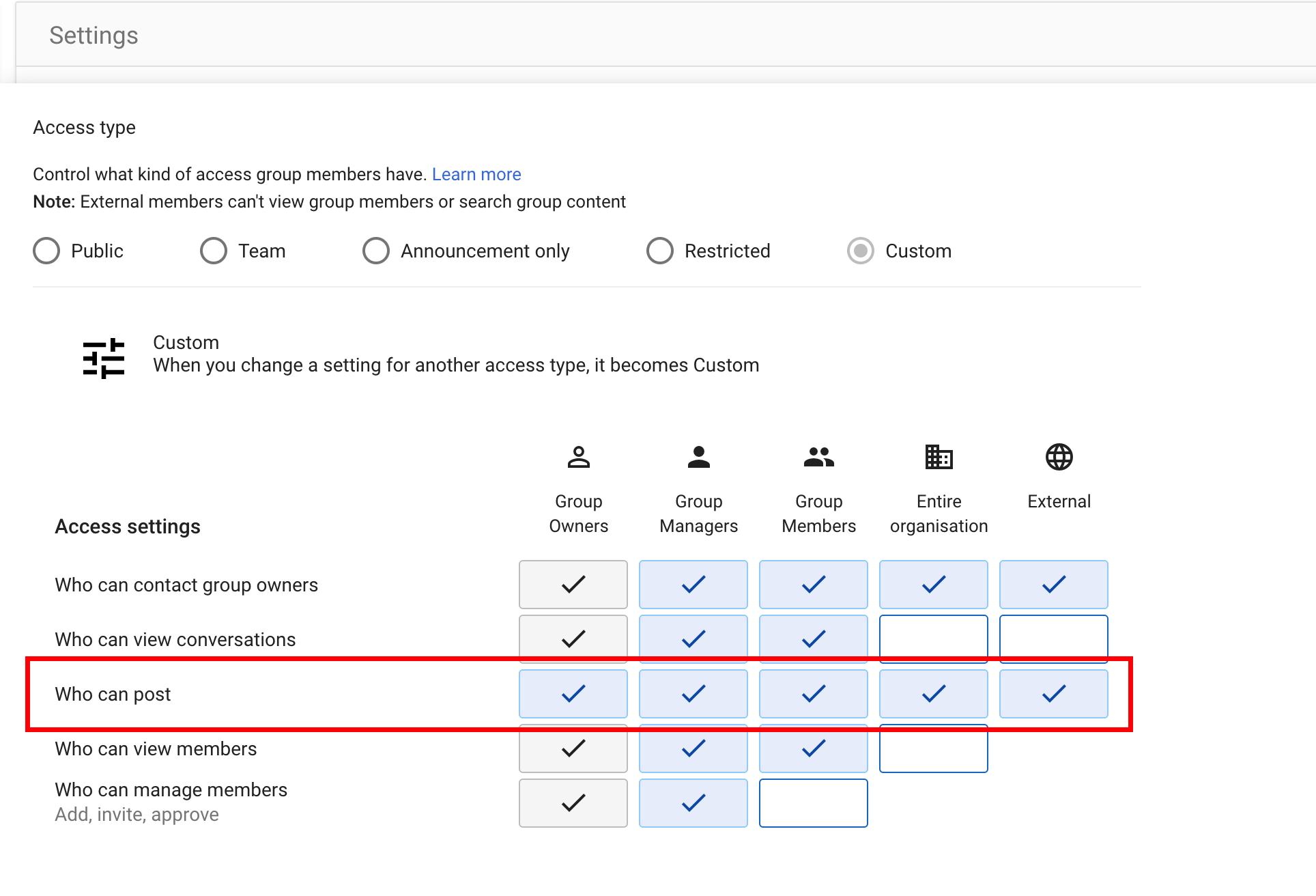Important - When creating a new Google Group always ensure that External people can “post” to the group's email address.